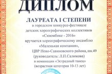 Поздравляем хореографический ансамбль «Детская компания» с 1 местом в городском конкурсе-фестивале хореографических коллективов «Сююмбике – 2016». Руковолитель: Салюкова Л.П.