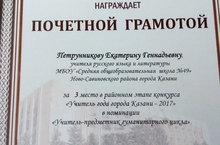 Коллектив школы поздравляет учителя русского языка и литературы Петрунникову Екатерину Геннадьевну, занявшую 3-е место в номинации «Учитель-предметник гуманитарного цикла» районного этапа конкурса «Учитель года города Казани – 2017»