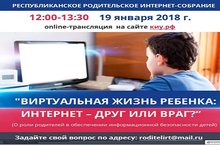 Во исполнение плана работы Министерства образования и науки Республики Татарстан 19.01.2018 с 12.00 до 13.30 состоится Республиканское родительское интернет-собрание «Виртуальная жизнь ребенка: интернет – друг или враг?». Он-лайн трансляция собрания будет вестись на сайте Казанского инновационного университета имени В.Г.Тимирясова по адресу: https://ieml.ru/.