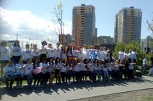 Ребята с красной лентой на груди, главным символом борьбы со СПИДом, провели флешмоб во время "Ярмарки Добра" в парке "Континент".