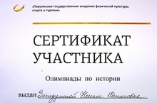 Загидулина Наиля приняла участие в межрегиональной олимпиаде по дисциплине "История" среди учащихся 11 классов, которую организовала и провела Поволжская Государственная Академия физической культуры,спорта и туризма.