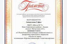 9А сыйныф укучысы Аввакумова Софья "Ларцадан могҗиза" V Республика рәсем һәм декоратив-гамәли иҗат конкурсында җиңүче булды. Җитәкчесе: Фәтхуллина А. Р.