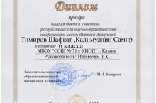 1 апреля ученики 6б класса Тимиров Шавкат и Калимуллин Самир стали призёрами в республиканской научно-практической конференции имени Фатыха Амирхана. Руководитель: Ишмеева Л.Х.