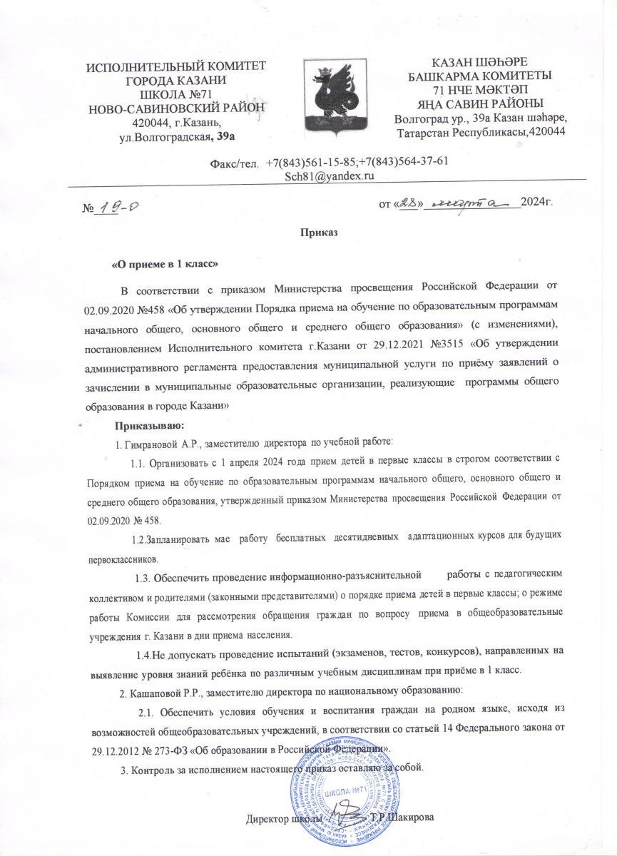 Приказ УО ИКМО г.Казани "О приеме детей в первые классы"