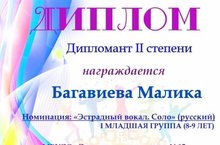 Поздравляем ученицу 1Б класса Багавиеву Малику, ставшую дипломантом 2 степени в V Республиканском фестивале-конкурсе "Весенний переполох". Руководитель: Хайруллина О.С.