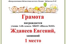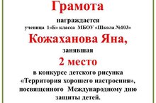 Поздравляем учеников 1Б класса Кожаханову Яну, Камашева Илью, Гилязееву Регину, Вдовину Елизавету, занявших 2 место в конкурсе рисунков от районной библиотеки 45 "Территория хорошего настроения" в честь Международного дня защиты детей.
