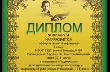Поздравляем ученика 1Б класса Гаффарова Алмаза (рук. Мухина Н.В.) , занявшего 1 место в Республиканском открытом конкурсе творчества "Тукай в наших сердцах" ! Желаем дальнейших творческих успехов!