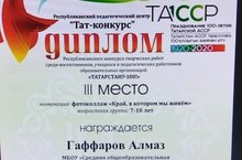 Поздравляем ученика 1Б класса Гаффарова Алмаза (кл.рук. Мухина Н.В.), занявшего 3 место в Республиканском конкурсе творческих работ, посвященных