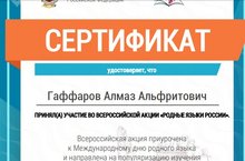 Ученик 1Б класса Гаффаров Алмаз (кл.рук. Мухина Н.В.) принял участие во Всероссийской акции "Родные языки России", приуроченной к Международному дню родного языка. -