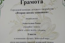 Ученик 1а класса Ахметгалиев Ринат награждён грамотой за 1место «Городским детским эколого-биологическим центром г. Казани. Поздравляем!