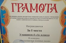 Учащиеся 4 а класса заняли 1 место в школьном конкурсе инсценированных песен. Молодцы!