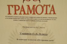 4а класс награждён грамотой за 1 место в конкурсе плакатов "Осторожно дети". Молодцы!