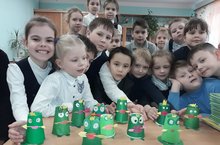 -Ученики 1 а класса (кл.рук.Фатыхова Л.И.) на уроке технологии мастерили необычные поделки из пластиковых и бумажных стаканчиков " Царевна - лягушка". Задача: показать как можно использовать упаковочные отходы в целях формирования экологической культуры жизненной позиции детей.