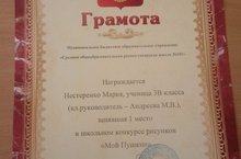 Поздравляем ученицу 3 в класса Нестеренко М(кл.рук-ль:Андреева М.В.)! В конкурсе рисунков"Мой Пушкин" ( школьный этап) 1 место!Работа отправлена на городской конкурс,ждем результатов!