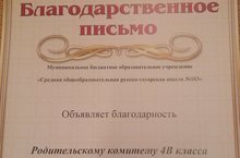 МБОУ "СОШ № 103" вручила благодарственное письмо родительскому комитету и классному руководителю Валиуллиной Э.А. за оказанную помощь в благоустройстве учебного кабинета