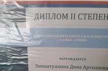 Дипломом 2 степени награждена ученица 1 а класса Зиннатуллина Дина, участвовавшая во Всероссийской интеллектуальной викторине "Самые-самые". Поздравляем!