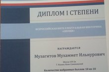 Поздравляем ученика 2 в классаМузагитова Мухамета (кл.рук-ль: Андреева М. В.). Он награжден Дипломом за 1 место в Всероссийской интеллектуальной викторине " Овощи".
