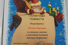 Ученица 2 в класса Пестова В,(кл. рук-ль: Андреева М. В.)награждена Почетной грамотой ОАО " Нефтехимпроекта" за активное участие в новогодней выставке детского творчества. Поздравляем!