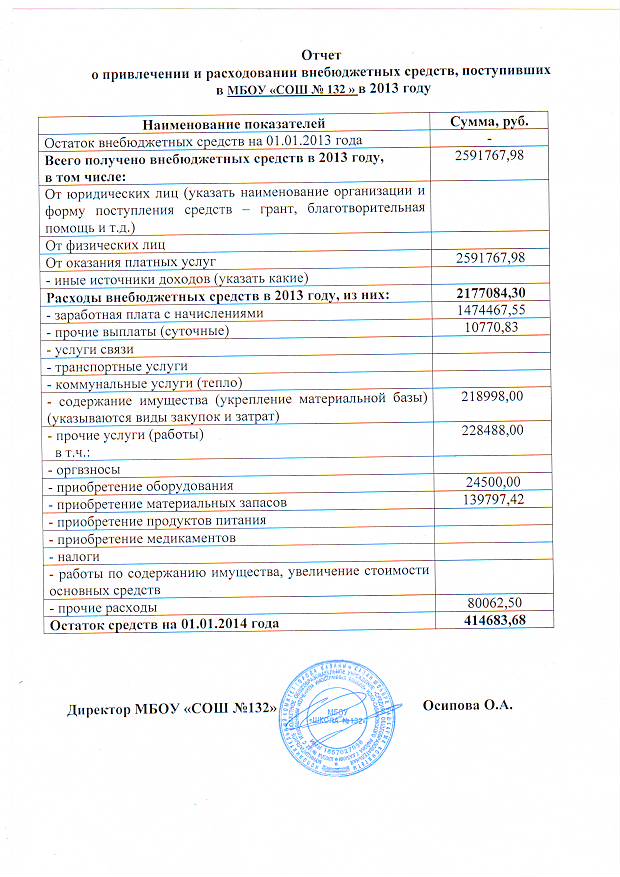 Отчет о поступлении и расходовании внебюджетных средств за 2013 год