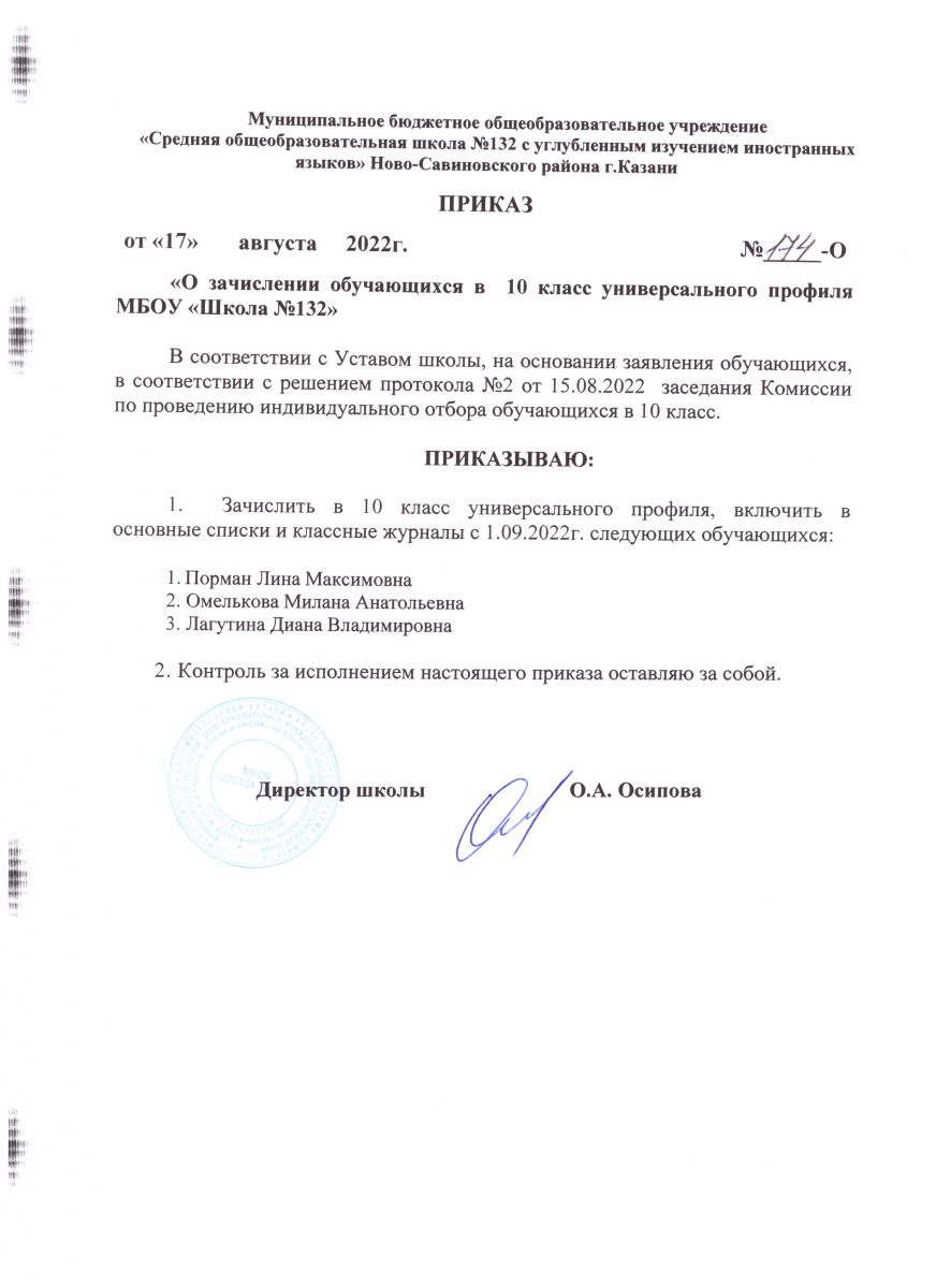 Зачисление в 10 класс оформляется приказом не позднее 7 рабочих дней после проведения индивидуального отбора.