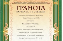 Вокальный конкурс"Казанский соловей - 2014" 20.02.2014 Поздравляем призеров городского конкурса "Казанский соловей" Галлямова Фаниса (2 место) руководитель Н.М.Ибрагимова в номинации "Народный вокал-соло", Хусаенову Зарину (3 место) руководитель Р.К.Загидуллина в номинации "Эстрадный вокал-соло"! Желаем дальнейших успехов!