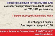 Набор учащихся в 7, 8 и 10 классы в Инженерный лицей-интернат КНИТУ-КАИ 06.04.2019Дорогие друзья!Инженерный лицей-интернат КНИТУ-КАИ объявляет набор учащихся в 7, 8 и 10 классы на 2019/2020 учебный год.1 апреля старт дистанционного этапа.Подробнее на https://lyceum.kai.ru/postuplenie и https://vk.com/kai.liceum