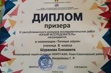 Ученица 8 Б класса Шуралева Л. стала призером III республиканского конкурса исследовательских работ "ЮНЫЙ ИССЛЕДОВАТЕЛЬ" в номинации "Точные науки". Научный руководитель: Низамеева Г.Р. Поздравляем!!!