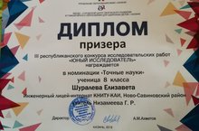 Ученица 8 Б класса Шуралева Л. стала призером III республиканского конкурса исследовательских работ "ЮНЫЙ ИССЛЕДОВАТЕЛЬ" в номинации "Точные науки". Научный руководитель: Низамеева Г.Р. Поздравляем!!!