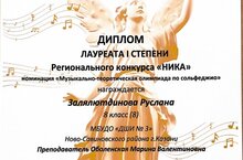 Поздравляем Залялютдинову Руслану - Лауреата I степени, Воронину Руслану - Лауреата III степени Регионального конкурса "Ника" в номинации "Музыкально-теоретическая олимпиада по сольфеджио", который прошел в городе Нижнекамск.
