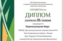 Поздравляем с успешным выступлением в Поволжском конкурсе эстрадного мастерства детских и юношеских творческих коллектив "Tatarstan.ru" Лауреата II Переведунцеву Киру (преподаватель Редреева Татьяна Вадимовна, концертмейстер Кирьянова Анна Дмитриевна).