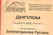 21 марта 2021г. состоялась Республиканская Олимпиада музыкально-теоретического цикла для учащихся ДМШ и ДШИ РТ "Музыкальный Олимп", где приняли участие и учащиеся нашей музыкальной школы. Поздравляем Лауреата II - Ильину Алису, Лауреата III - Залялютдинову Руслану, Дипломанта I степени Шошеву Самиру и их преподавателей Оболенскую Марину Валентина и Аширову Анастасию Алексеевну.