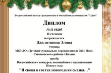 Поздравляем с успешным выступлением во Всероссийском конкурсе, посвященного празднованию Нового года "И снова в гостях новогодняя сказка..." Давлитшину Элину - Дипломанта II степени, преподавателя Саитгарееву Райсу Тимерьяновну и концертмейстера Антонову Анастасию Владимировну!