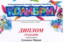 Поздравляем Гужавина Марата обладетеля Гран-при в III Международном конкурсе детского творчества «Колибри -2019» под руководством Бадериной Елены Владимировны!
