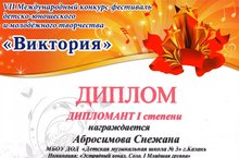 Поздравляем с успешным выступлением на VII Международном конкурсе-фестивале детского и юношеского творчества "ВИКТОРИЯ" Дипломанта I степени Абросимову Снежану и Дипломанта III степени Миншину Карину и их преподавателя Дольникову Дарью Сергеевну!
