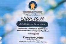 Поздравляем Дипломанта I степени Всероссийского конкурса-фестиваля вокально-хорового и народного инструментального исполнительства "Яблонь белый цвет" - Кутыреву Софью в номинации "Эстрадный вокал-соло".