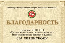 Администрация Казанского музыкального колледжа им.И.В.Аухадеева выражает директору С.И.Литинскому и всему коллективу ДМХШ №3 благодарность за высокий профессионализм и педагогическое мастерство в воспитании широко образованных и профессионально ориентированных музыкантов!