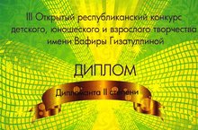 Поздравляем с успешным выступлением на III Открытом республиканском конкурсе детского, юношеского и взрослого творчетсва имени Вафиры Гизатуллиной Дипломантов II степени - Жукову Валерию, преподаватель Юнусова Н.А., концертмейстер Блинова В.Л., и Осипову Дарью, преподаватель Гайнуллин А.Р., концертмейстер Солтыханова А.А., Дипломанта III степени Климкову Еву, преподаватель Бус Л.С. Желаем дальнейших творческих побед!