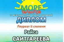 Поздравляем преподавателя Саитгарееву Райсу Тимерьяновну - Лауреата 2 степени II Международного конкурса дарований "Море талантов".