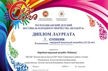 Поздравляем Лауреата 2 степени Республиканского детского фестиваля народного творчества"Без бергэ" народный вокальный ансамбль "Родничок" под руководством Кутдусовой Натальи Николаевны, концертмейстеры Чиганаева Анастасия Владимировна, Помясов Сергей Викторович.
