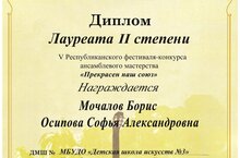Поздравляем с успешным выступлением на V Республиканском фестивале-конкурсе ансамблевого мастерства "Прекрасен наш союз" Лауреатов 2 степени - Мочалова Бориса и ансамбль домристов "Веселые нотки" (Клеопатров Д., Переверзев Д., Искандаров А.), руководитель Осипова Софья Александровна и концертмейстер Кириллова Надежда Витальевна.