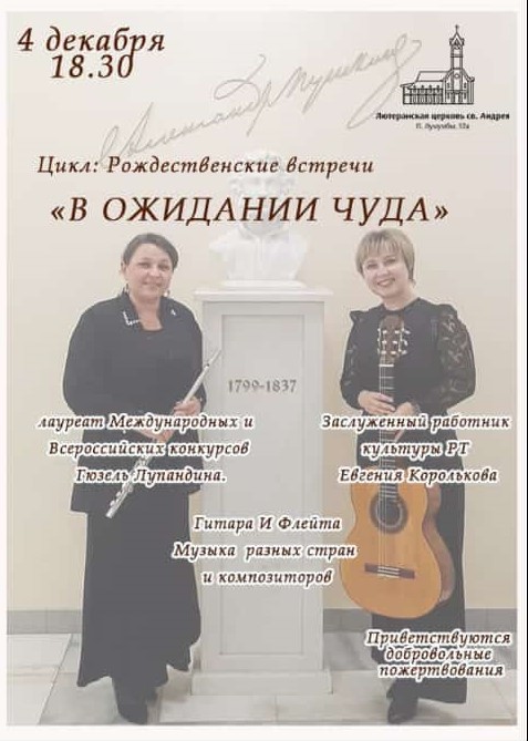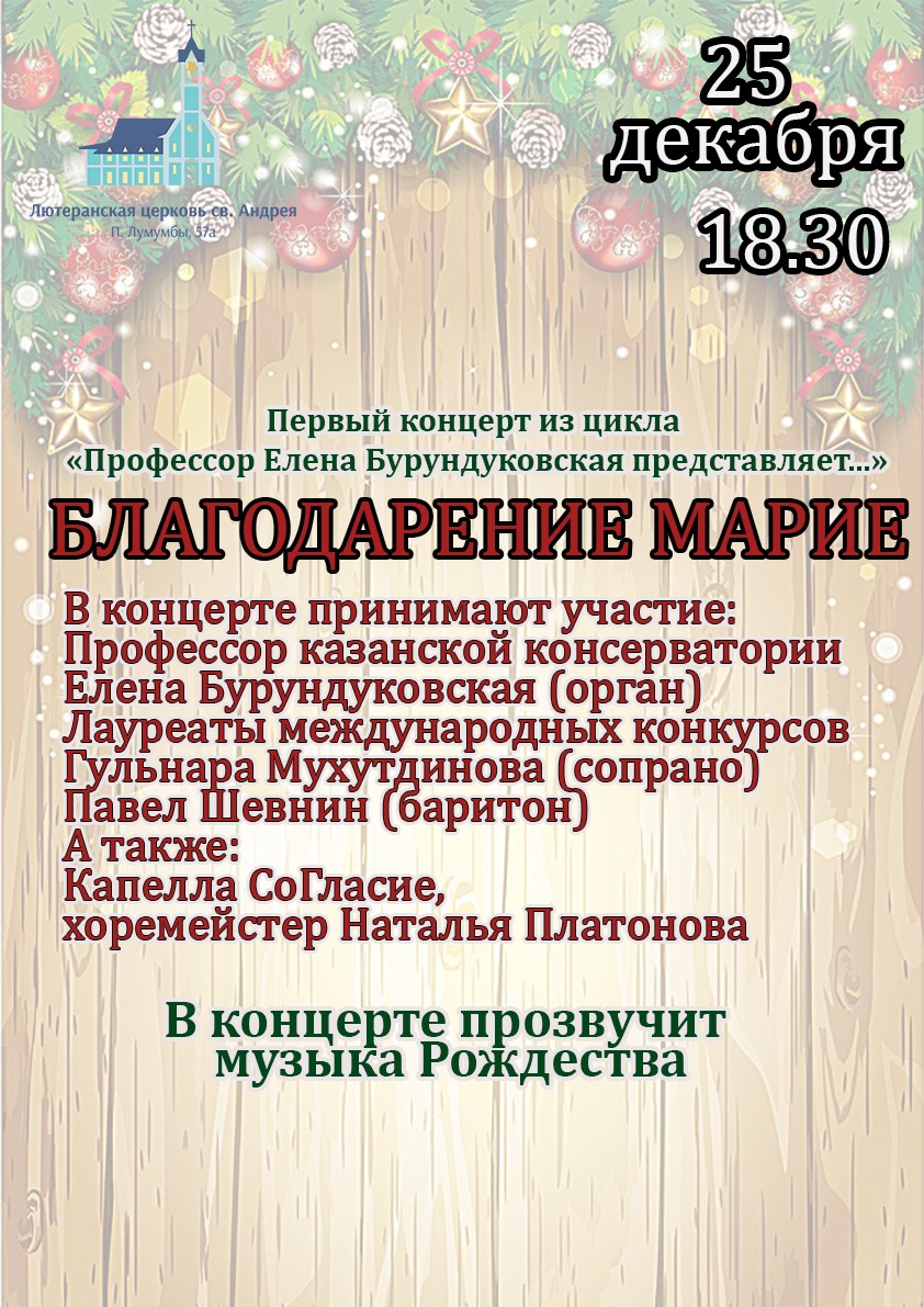 Первый концерт из цикла «Профессор Елена Бурундуковская представляет…» состоится 25 декабря в здании Евангелическо- Лютеранской церкви св. апостола Андрея по адресу П. Лумумбы, 57а. Начало – в 18.30.