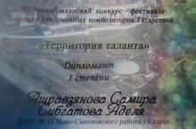 18 февраля в Казани состоялся Республиканский конкурс «Территория Таланта», на котором исполнялись произведения ныне живущих авторов - наших современников, членов Союза композиторов РТ. Было интересно участвовать в этом конкурсе, а наши учащиеся – дуэт Ашрафзянова Самира и Сибгатова Аделя (фортепиано и синтезатор), класс преподавателя Ядовой Ирины Вячеславовны – стали дипломантами I степени, и первоклассница Макарова Камилла, класс преподавателя Еникеевой Наили Ахметовны, стала Дипломантом II степени.