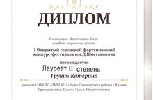 17 февраля состоялся I открытый Городской фортепианный конкурс им. Д. Шостаковича, на котором в очень серьёзной конкурентной борьбе Катерина Груйич, учащаяся преподавателя Галеевой Гузаль Мухаметзиевны стала Лауретом II степени!