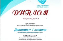 8 декабря Кутьин Ваня, учащийся Московцевой О.Р. стал Дипломантом I степени на Международном конкурсе «Хрустальное сердце мира», а 9 декабря наши мальчики Иванов Алексей и Хасанзянов Эдуард (преподаватель Д.И. Бабич), несмотря на возникшие трудности (по техническим причинам пришлось сроно менять баян и игратьна совершенно незнакомом инструменте)достойно выступили на Всероссийском конкурсе «Территория творчества» и стали Дипломантами I cтепени! Поздравляем!