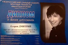Учащийся нашей школы Егоров Дмитрий стал Дипломантом на очень сложном и серьёзном Всероссийском конкурсе пианистов им. Ю. Егорова, проходившем в Казанской государственной консерватории 10 ноября 2017 г. Желаем ему и его преподавателю Еникеевой Наиле Ахметовне дальнейших творческих успехов!