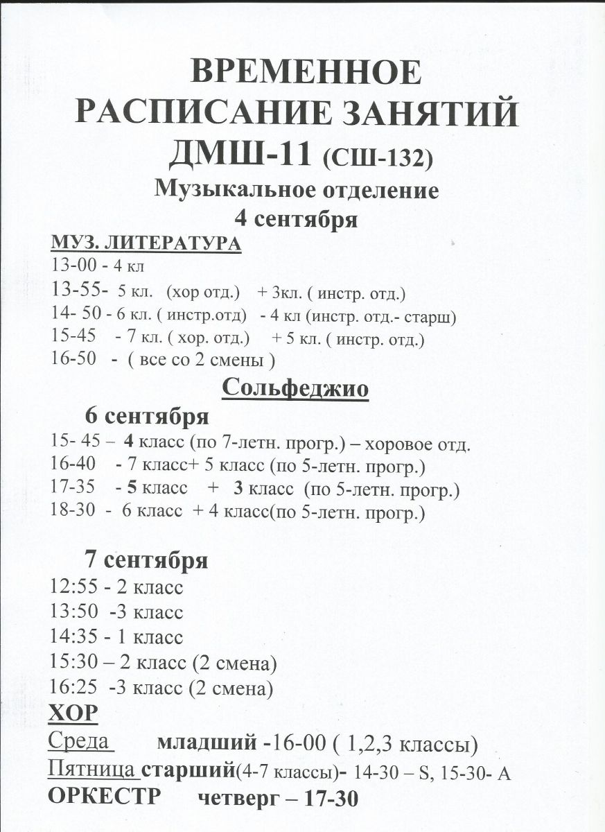 Временное расписание занятий на базе СОШ 132 (музыкальное отделение)
