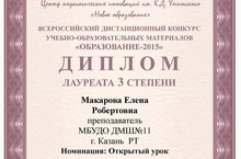 Поздравляем Макарову Елену Робертовну с победой - Диплом 3 место - во Всероссийском дистанционном конкурсе учебно-образовательных материалов "Образование-2015"