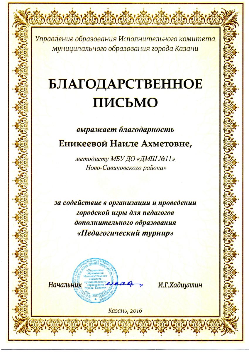 4 Еникеева Н.А. Благодарственное письмо "Педагогический турнир"