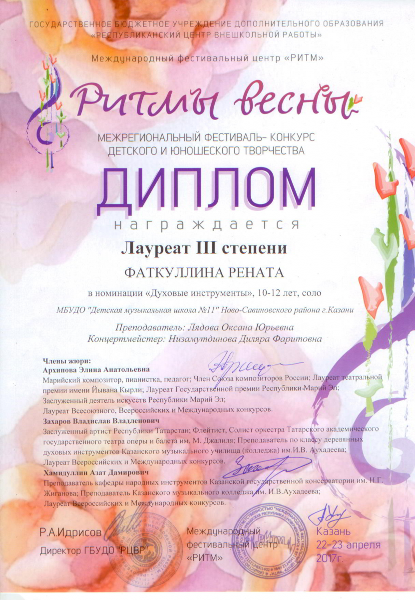 14 Фаткуллина Рената Лауреат III степени "Ритмы весны"