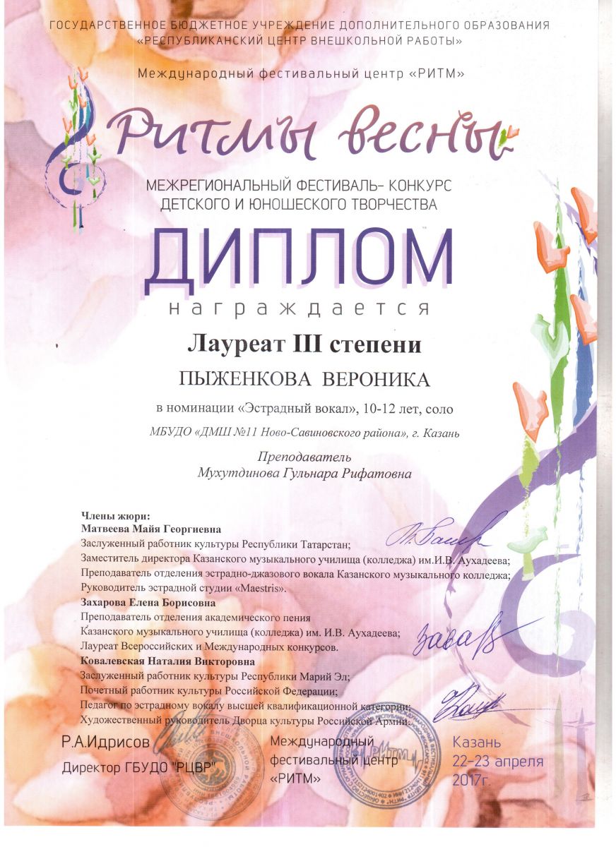 7 Пыженкова Вероника Лауреат III степени "Ритмы весны"